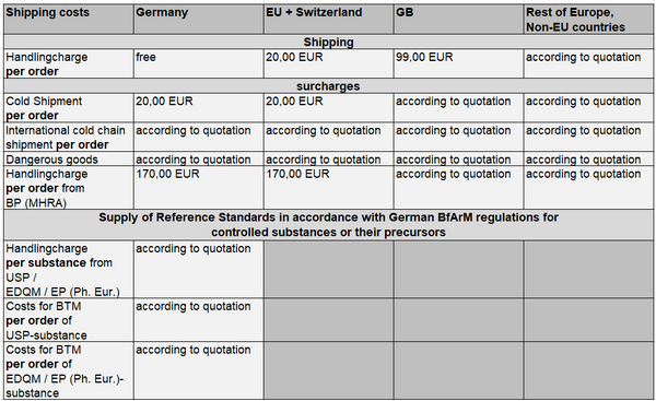 We charge the shipping fees shown in the overview below. In the case of USP Reference Standards to be procured in the USA, we reserve the right to charge an exchange rate surcharge if the euro remains weak against the US dollar.