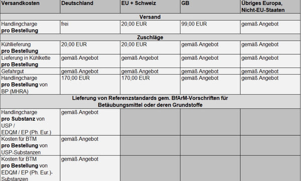 • Dazu addieren sich versandabhängige Kosten, bei USP-Referenzstandards ggf. ein Wechselkursaufschlag, sofern der